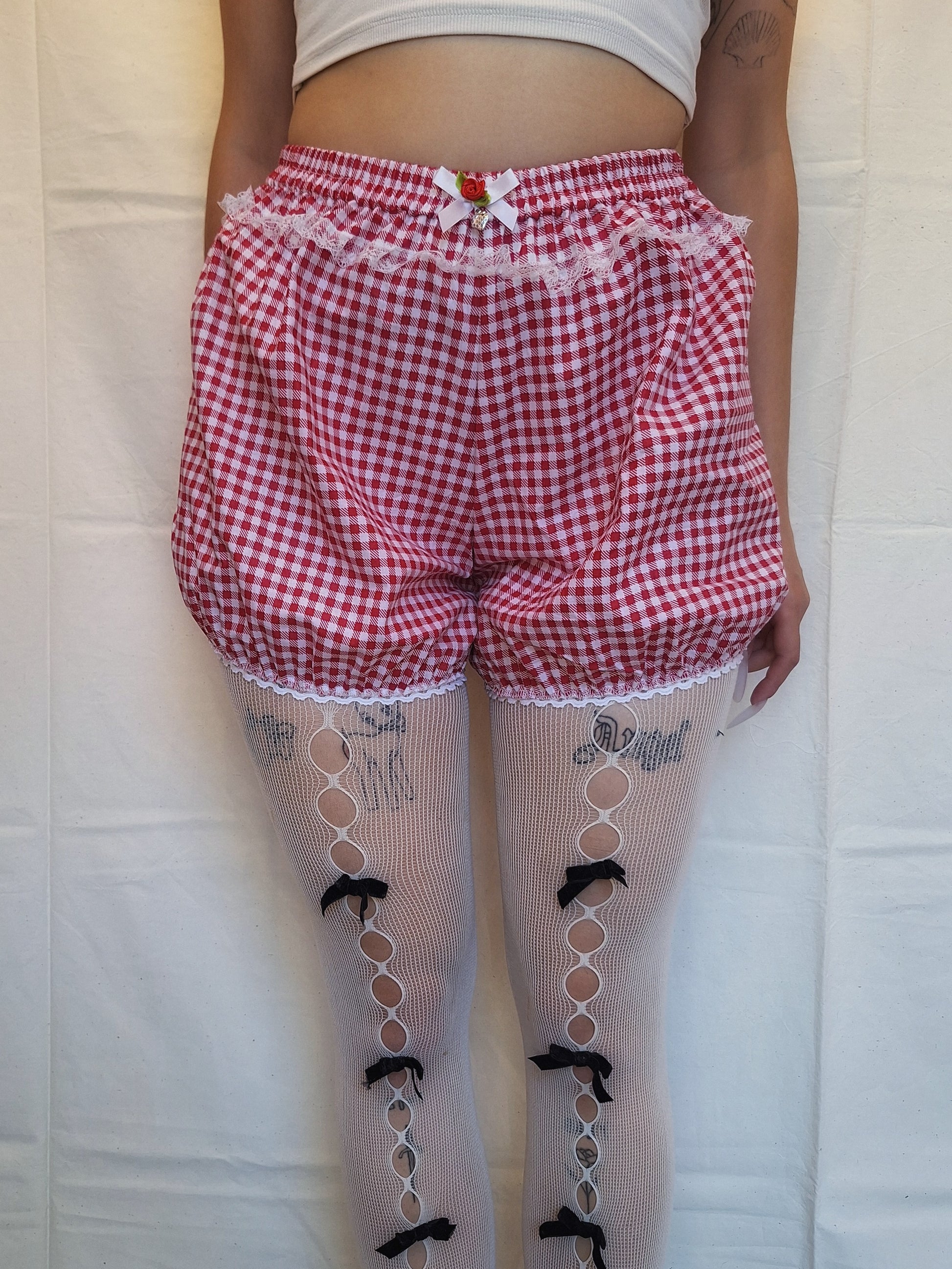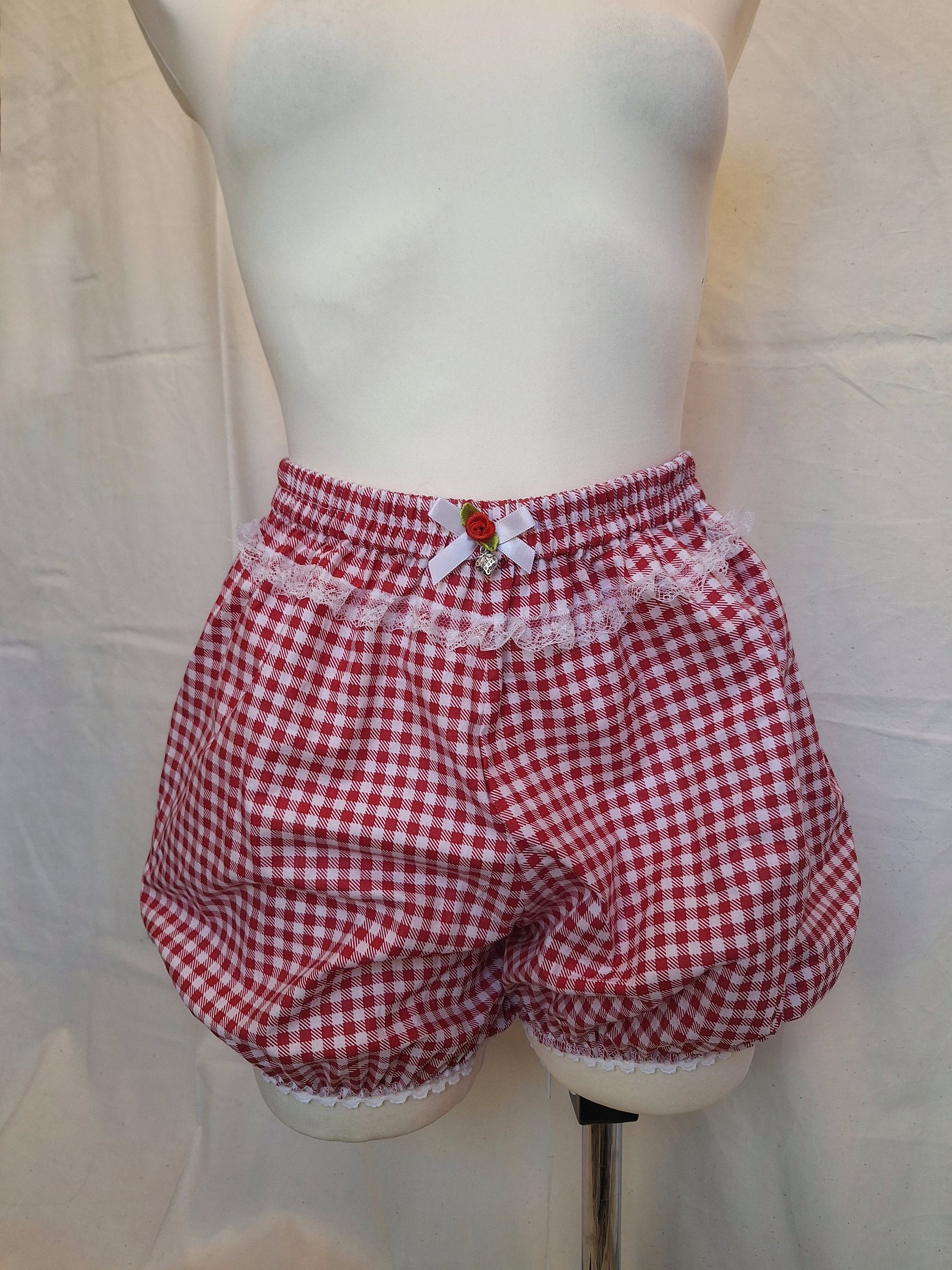 Szorty typu bloomers z bawełny. W pasie i przy nogawkach jest wszyta guma, dzięki której szorty idealnie dopasowują się do sylwetki. Uszyte z użyciem materiałów z upcyklingu.