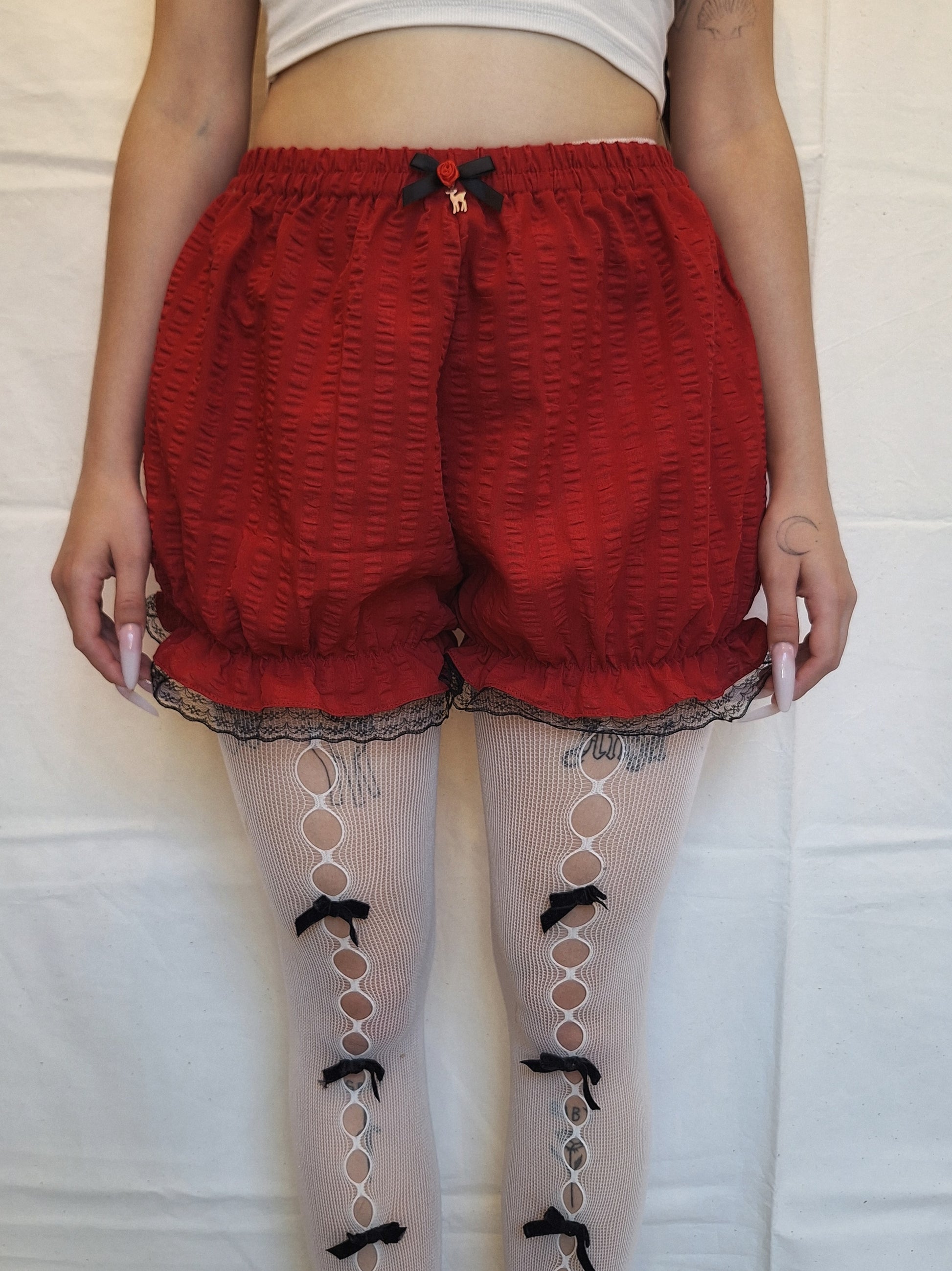 Szorty typu bloomers z bawełny. W pasie i przy nogawkach jest wszyta guma, dzięki której szorty idealnie dopasowują się do sylwetki. Uszyte z użyciem materiałów z upcyklingu.