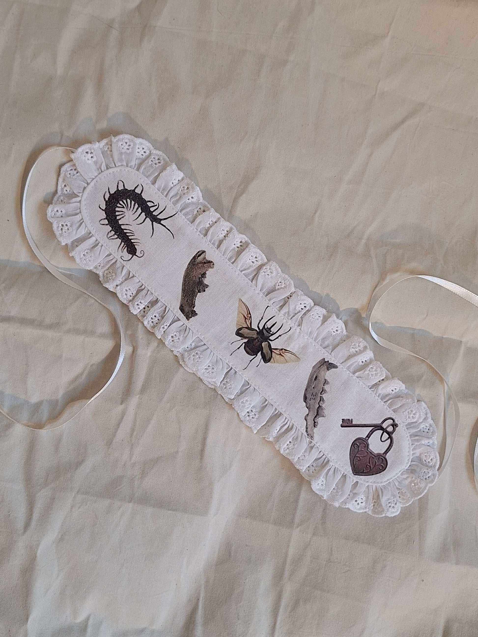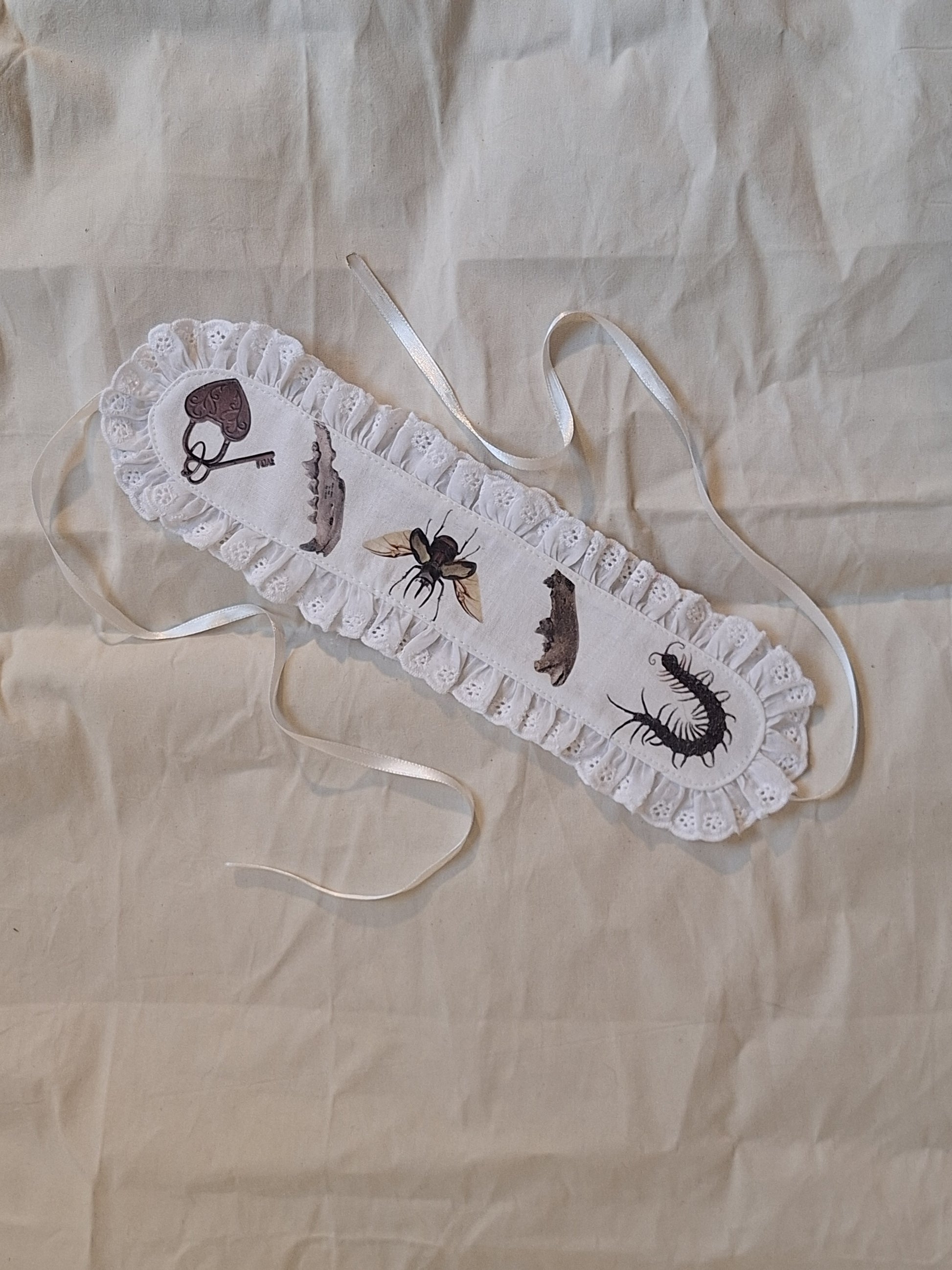 Headdress z nadrukiem, obszyty koronką, wiązany