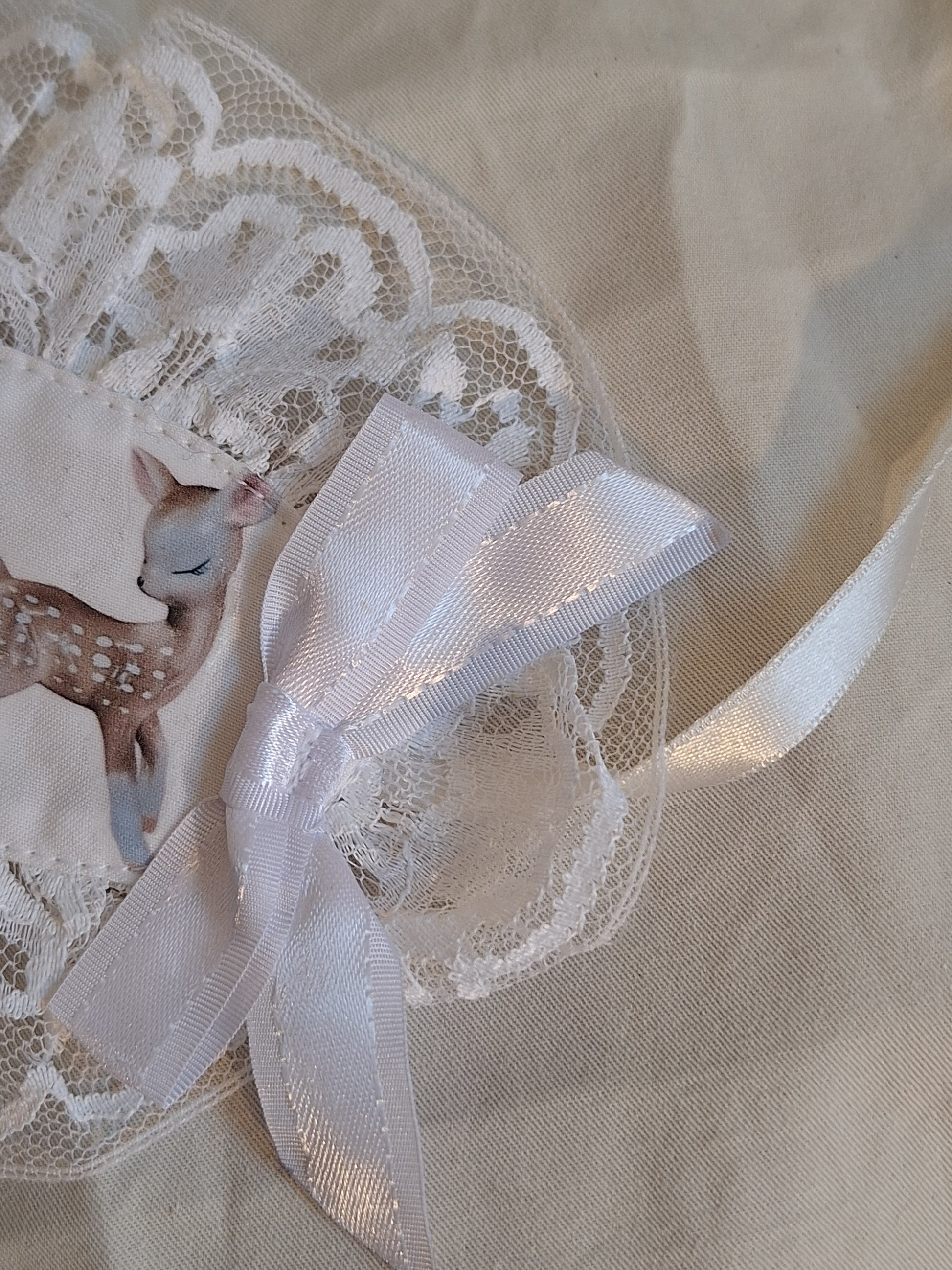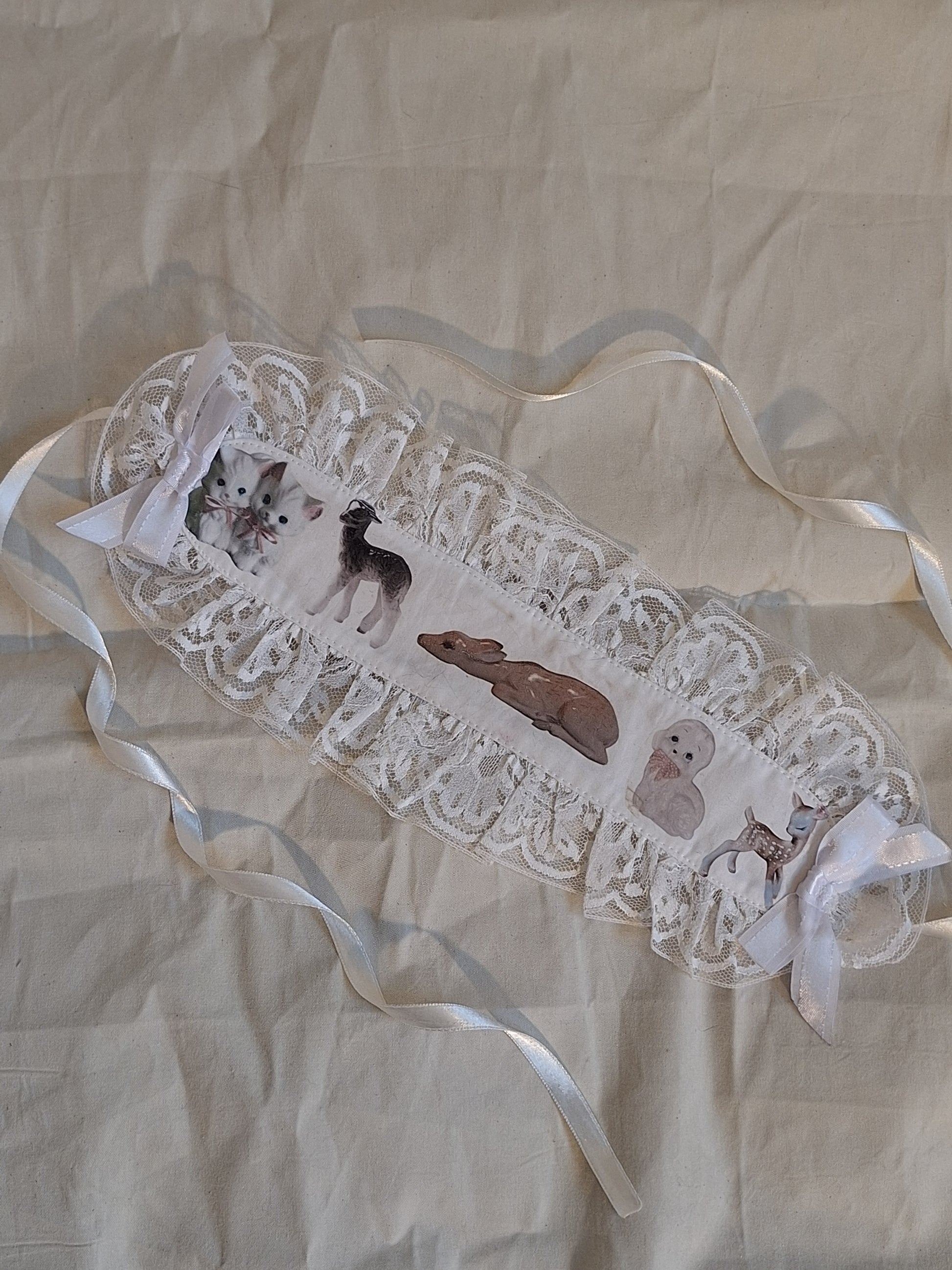 Headdress z nadrukiem, obszyty koronką, wiązany