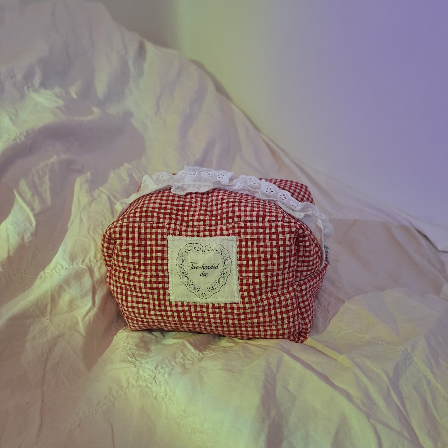 Kosmetyczka w czerwoną kratkę, uszyta z materiałów z upcyklingu.