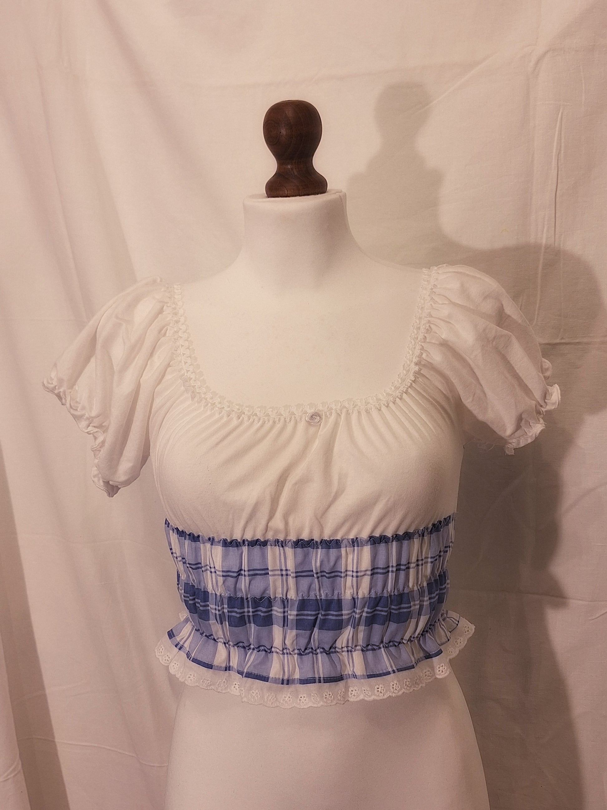 Bluzka typu milkmaid, uszyta z materiałów z upcyklingu.