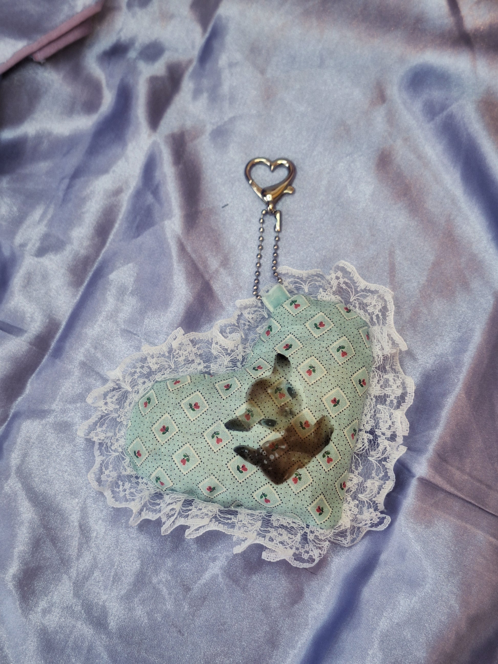 Pluszowy brelok z nadrukiem, uszyty z użyciem materiałów z upcyklingu.