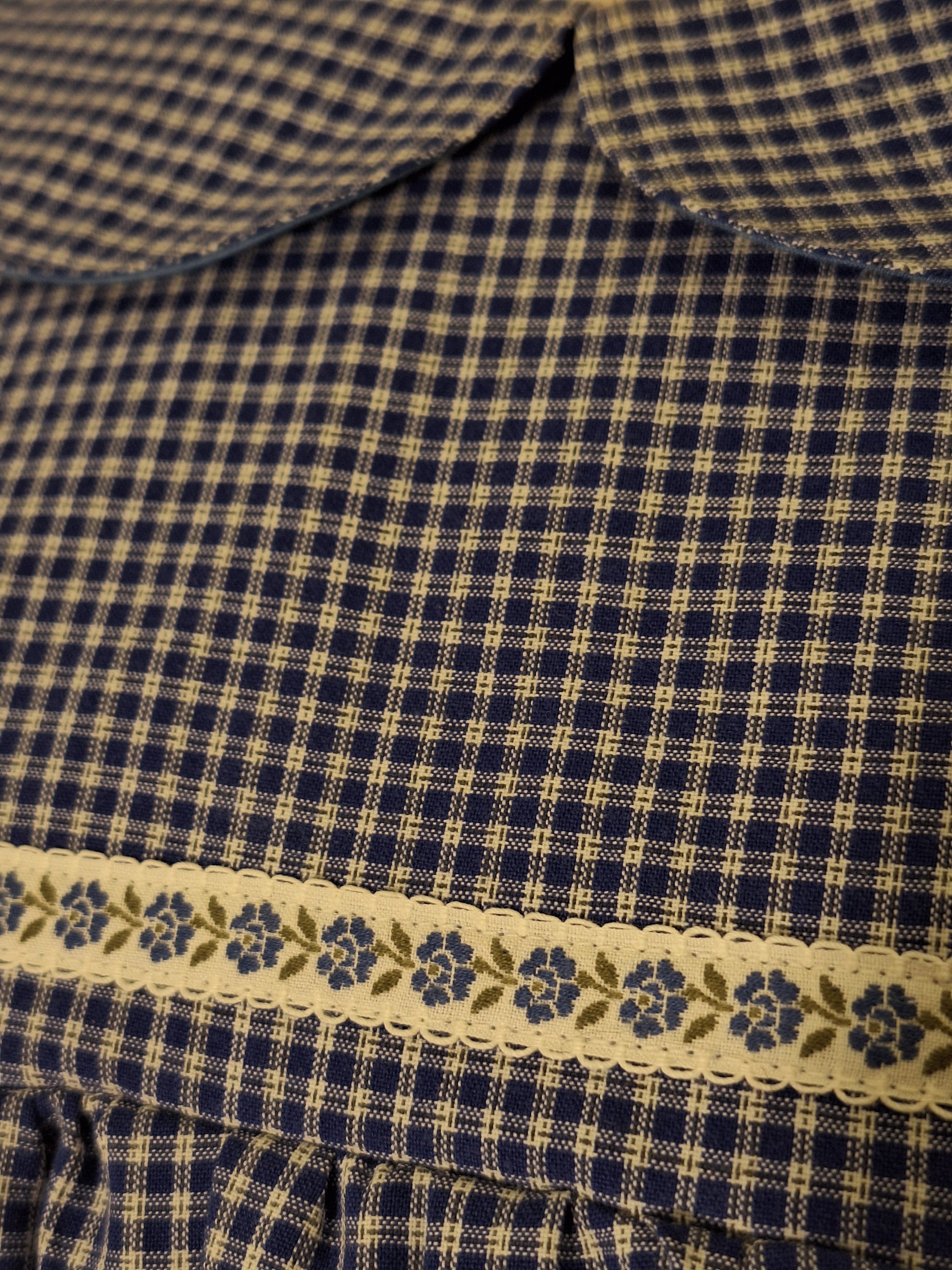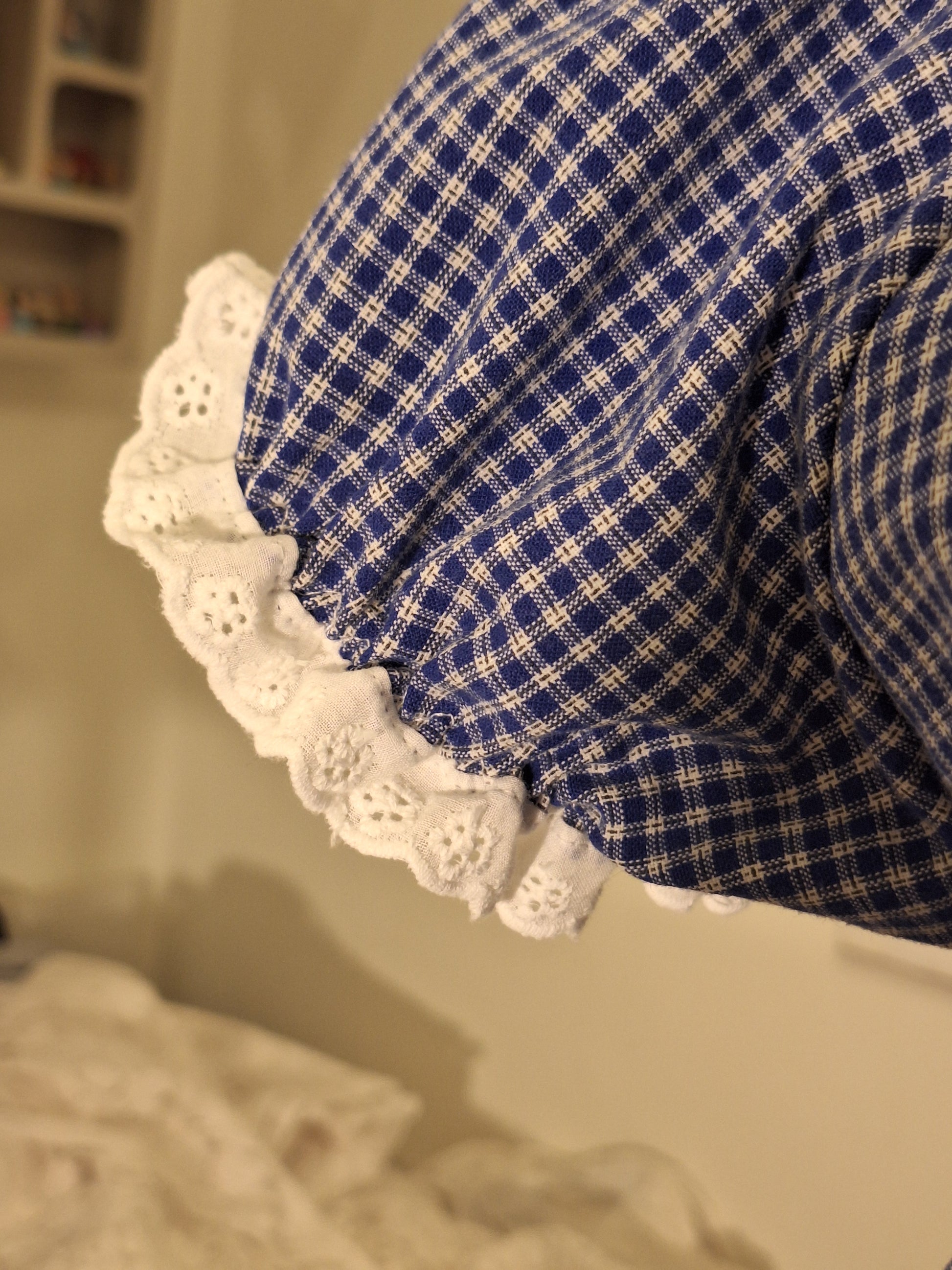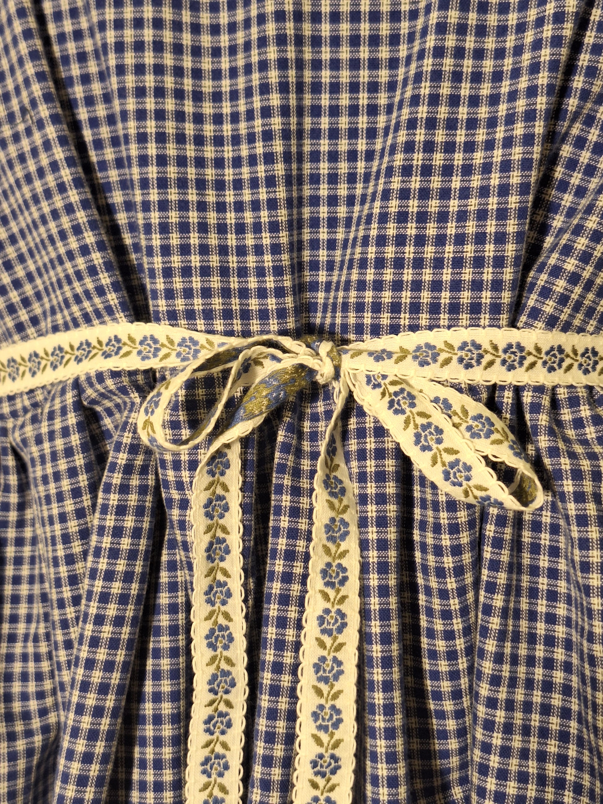 Krótka sukienka w kratkę o kroju babydoll, uszyta z materiałów z upcyklingu. Z tyłu posiada wiązanie, dzięki którym można dopasować szerokość.