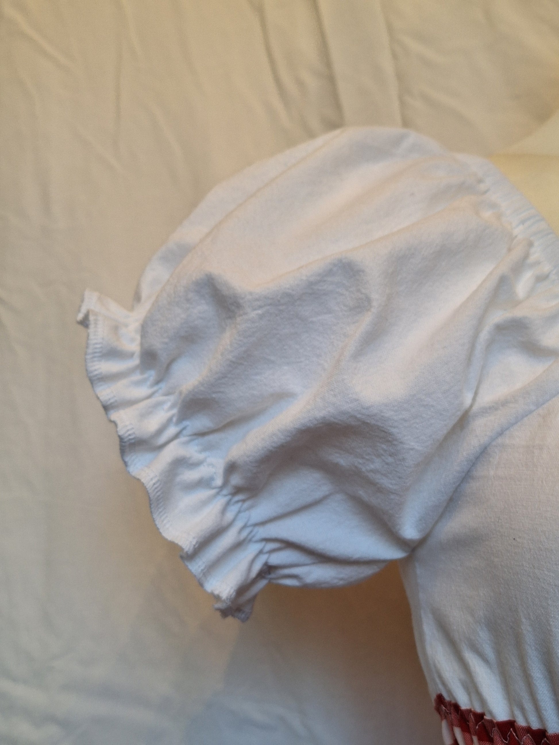 Sukienka typu milkmaid, uszyta z materiałów z upcyklingu.