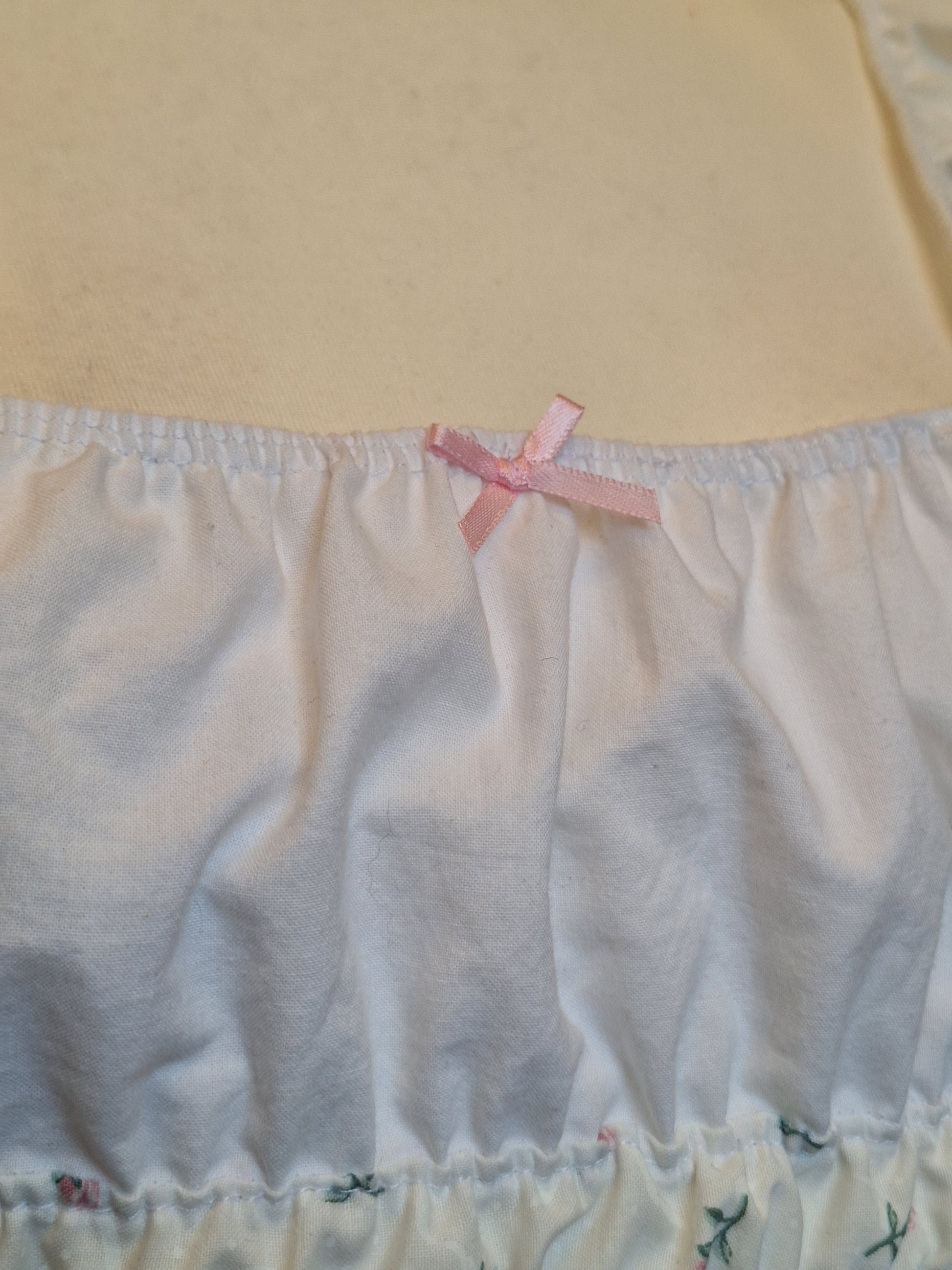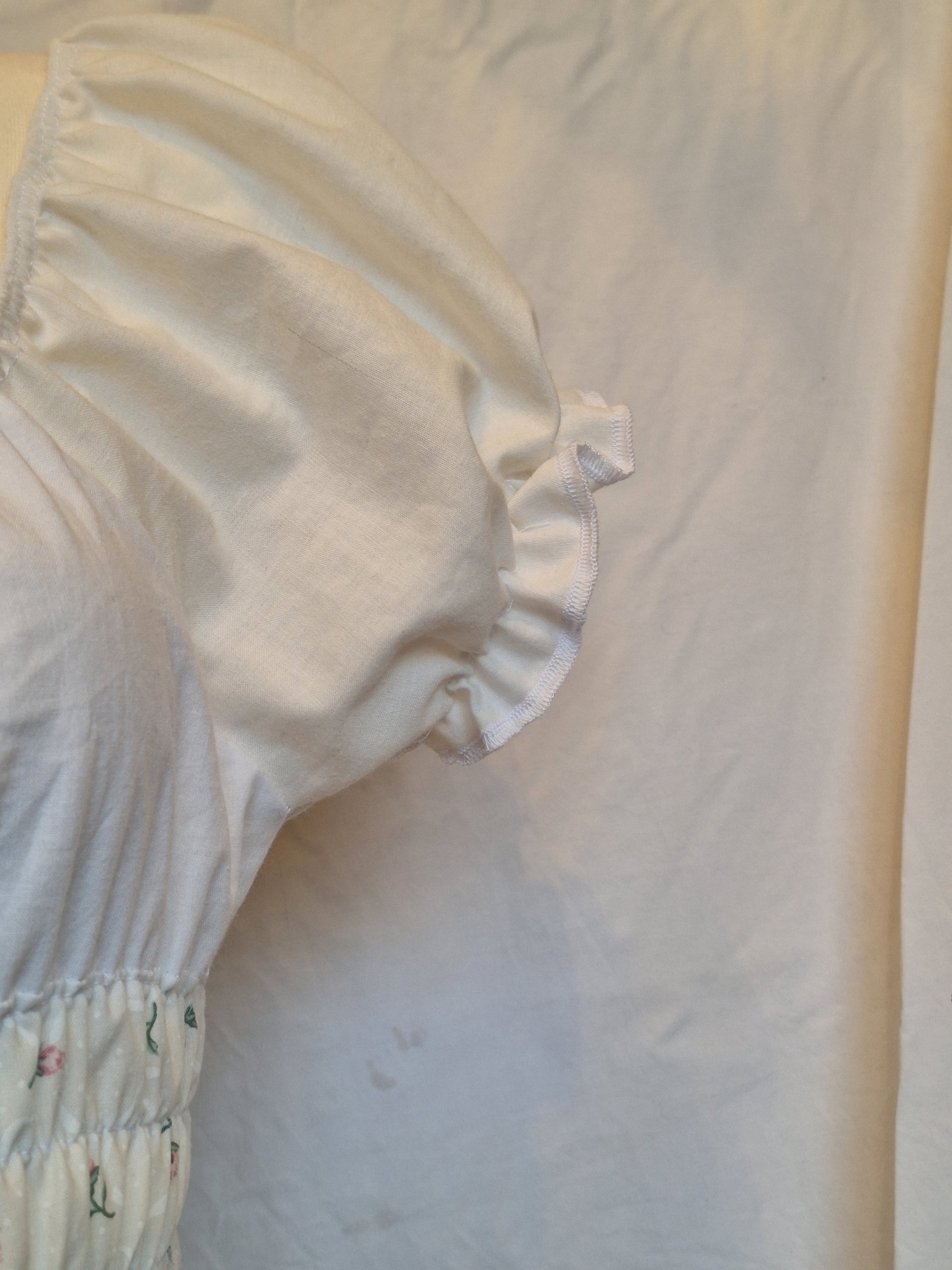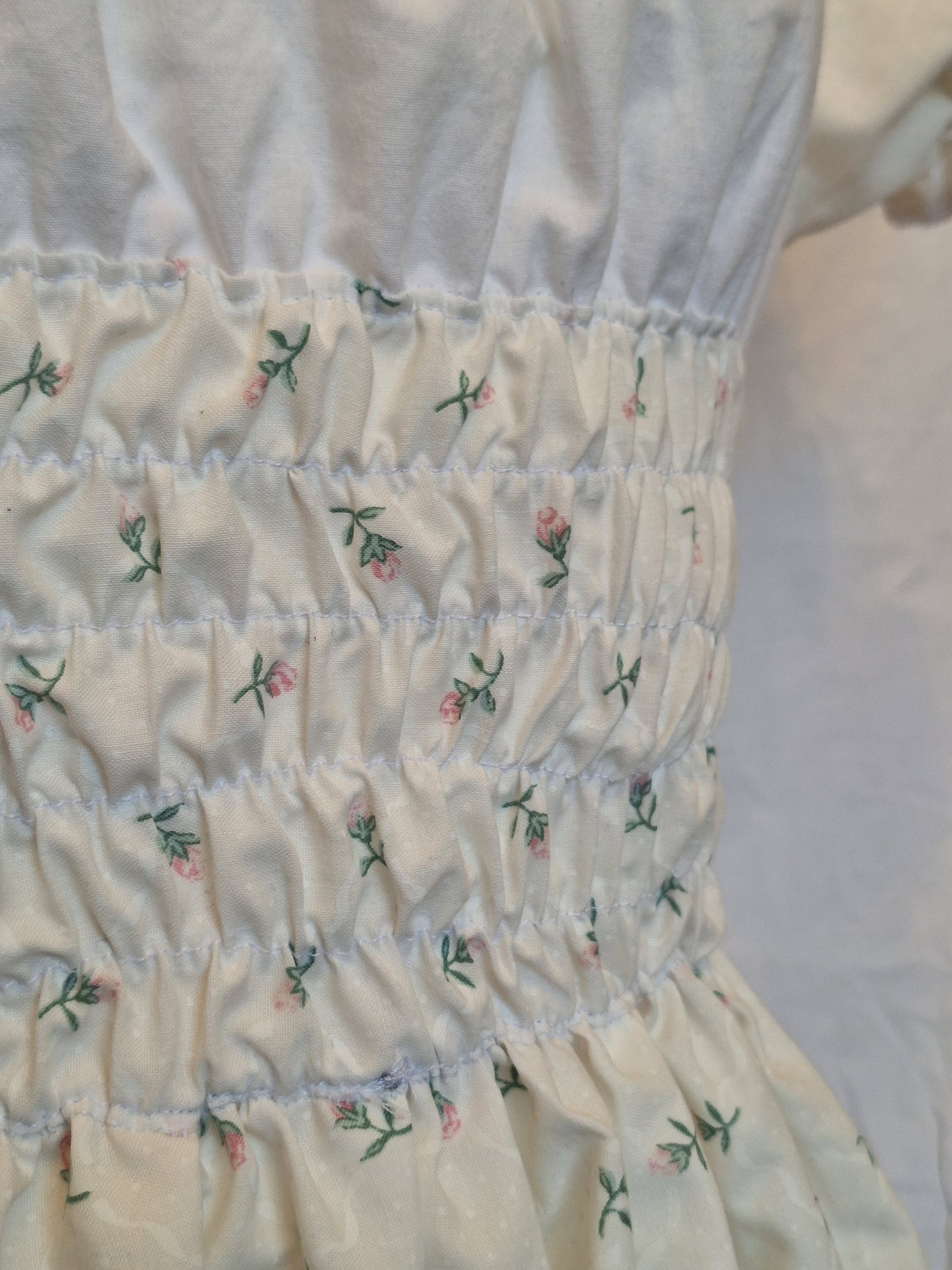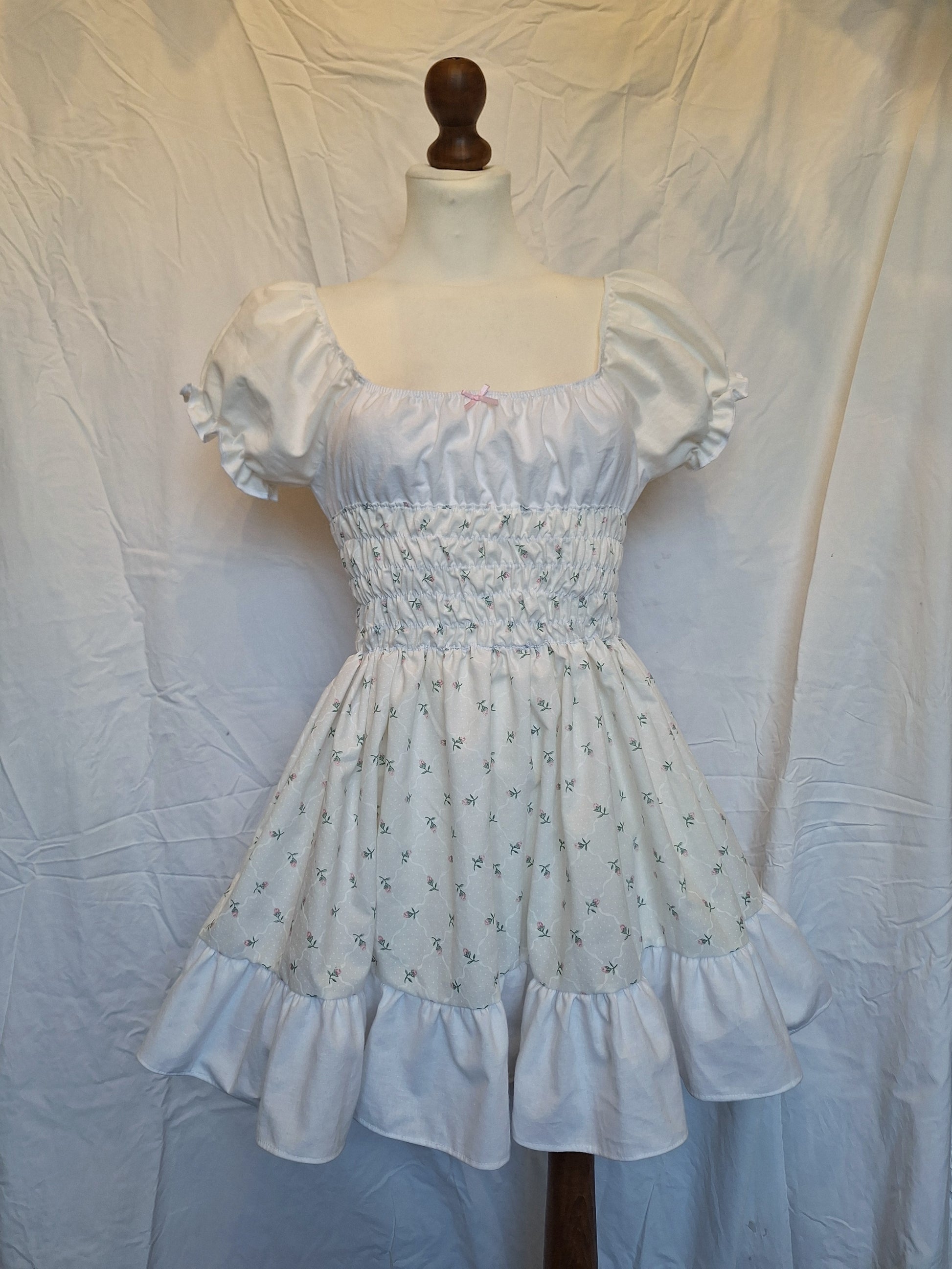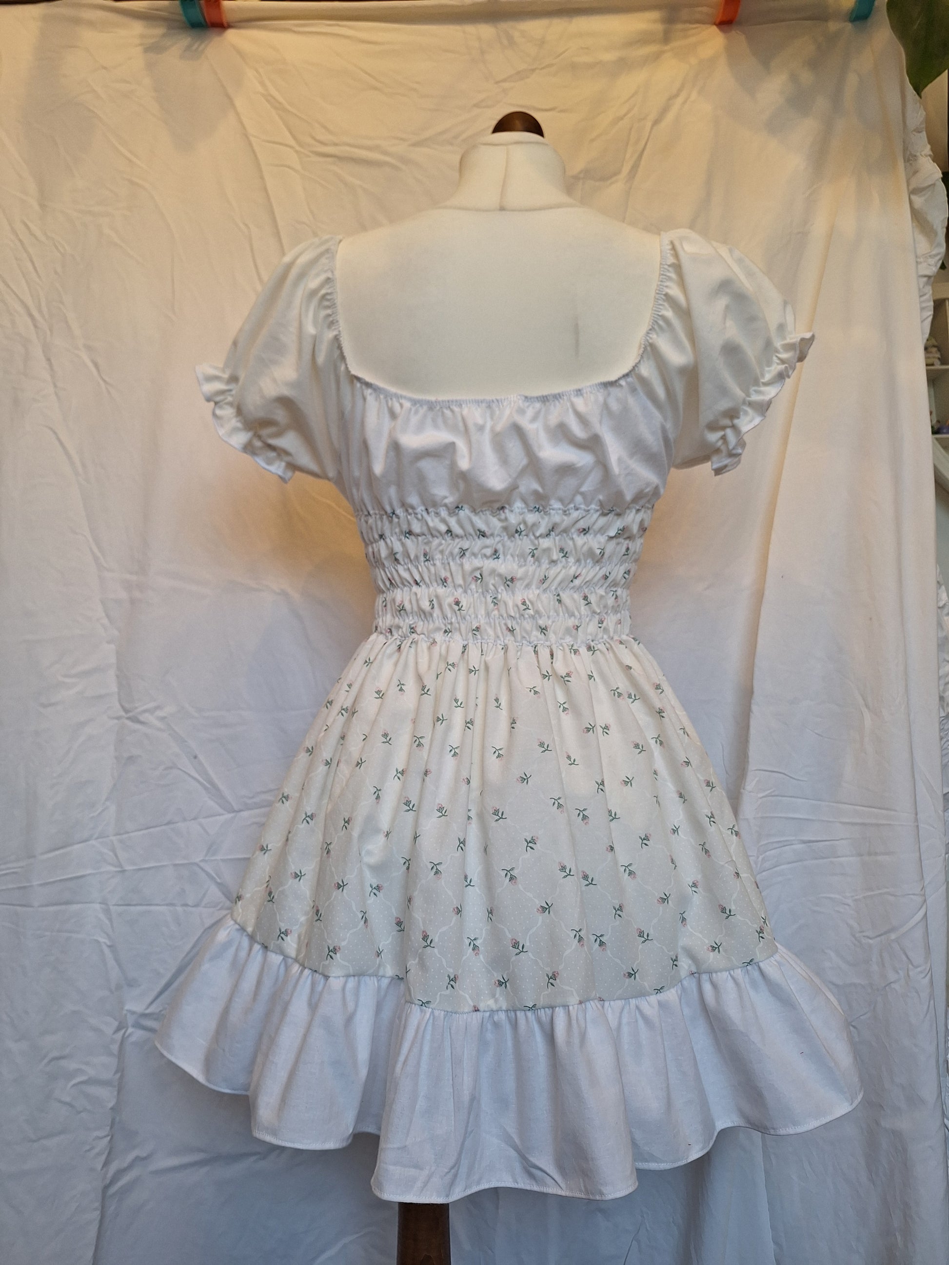 Sukienka typu milkmaid, uszyta z materiałów z upcyklingu.