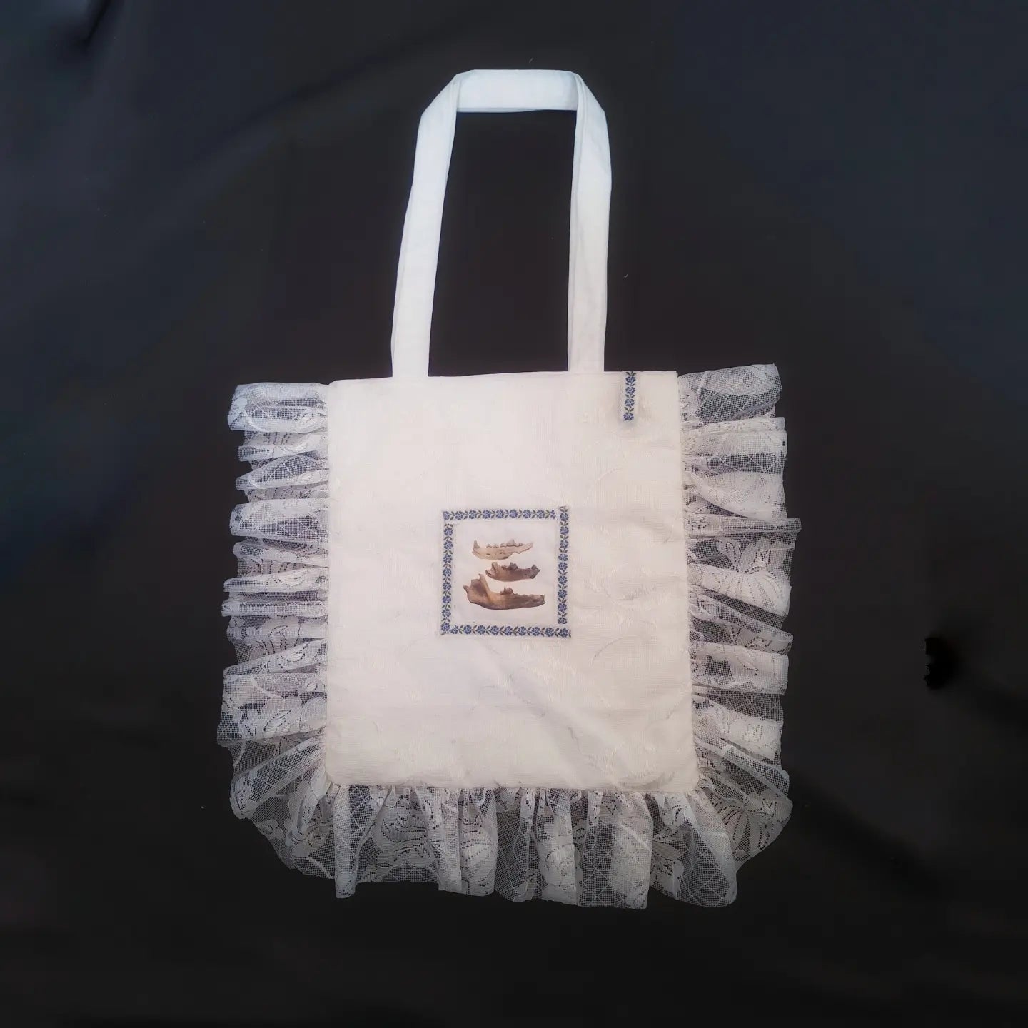 Torba koronkowa typu tote bag z motywem kości, uszyta z materiałów z upcyklingu.